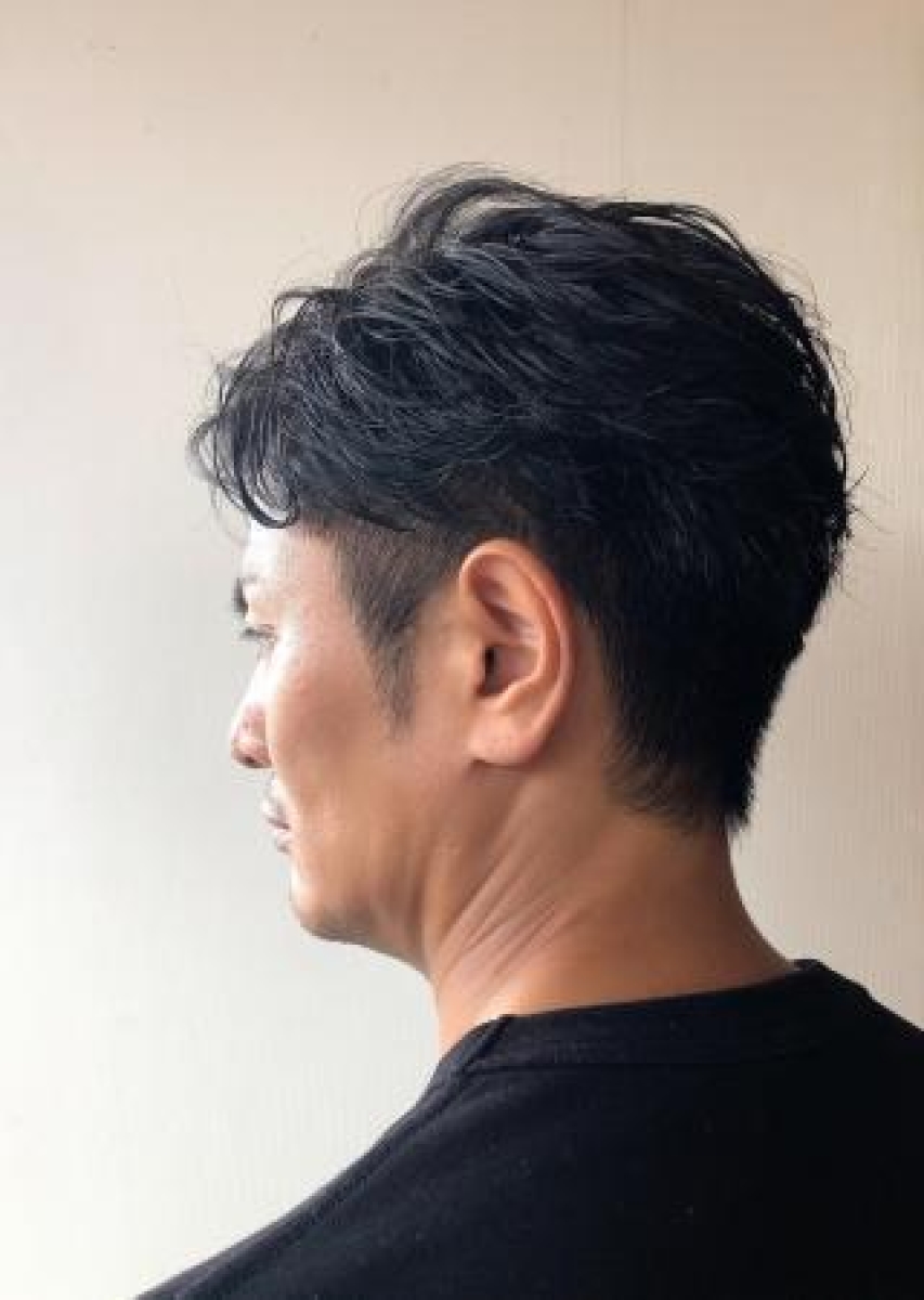 ツーブロックのショートスタイルに、トップに流れるパーマを行うことにより、自然な立ち上がりを与えエレガントなスタイルにしています。
