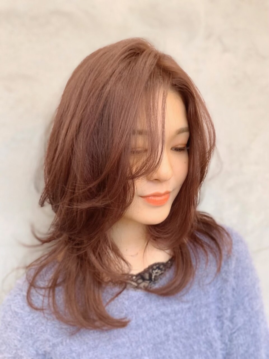 透明感も温かみもあり春色カラー!ウルフレイヤーを入れて軽さもプラス!!柔らかい雰囲気に見せたい方オススメです。