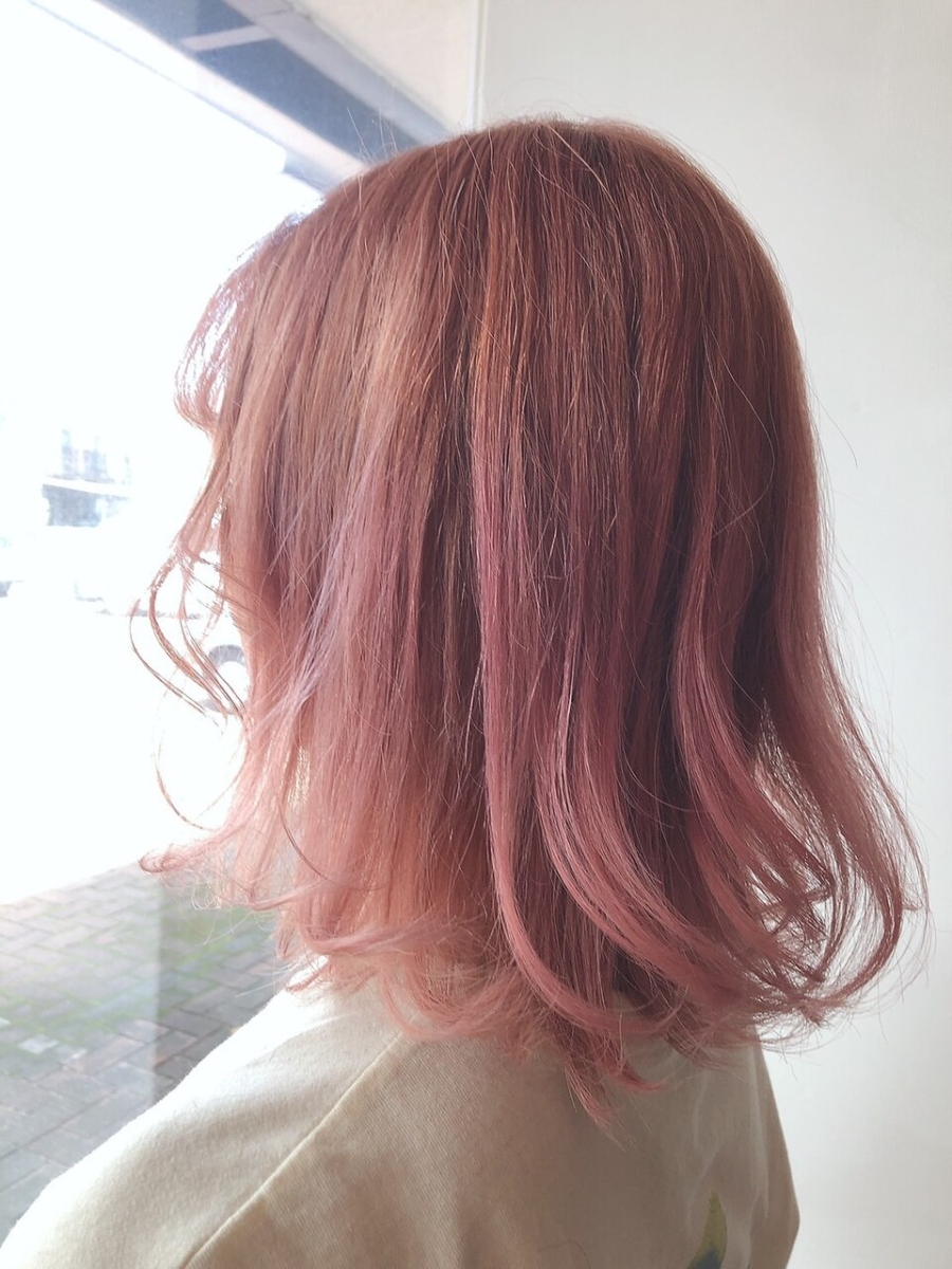 細かいハイライトでスジ感をあまり主張せずにすることでオレンジ~ピンクへと透き通るようなかわいらしさのあるグラデーションカラーにしています。透け感+外ハネのトレンドを存分に生かしたスタイルになります。