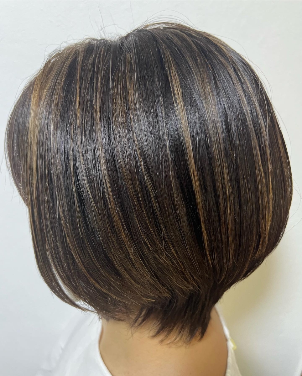 白髪がハイライトカラーに馴染むので、気になりにくいです!お出かけ前にはオイルか、バームのしっとり艶の出るスタイリング剤をつけると、ハイライトが綺麗に見えます。