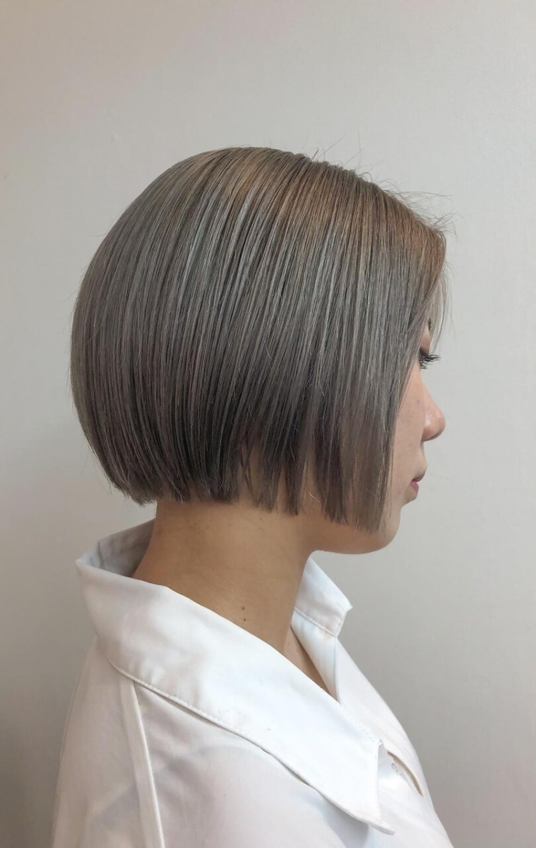 ミニボブスタイルは重く見えやすいので透け感のあるカラーをする事で軽さを演出出来ます。出来ればパサパサにならない様にすきバサミを使い過ぎないのがオススメです。