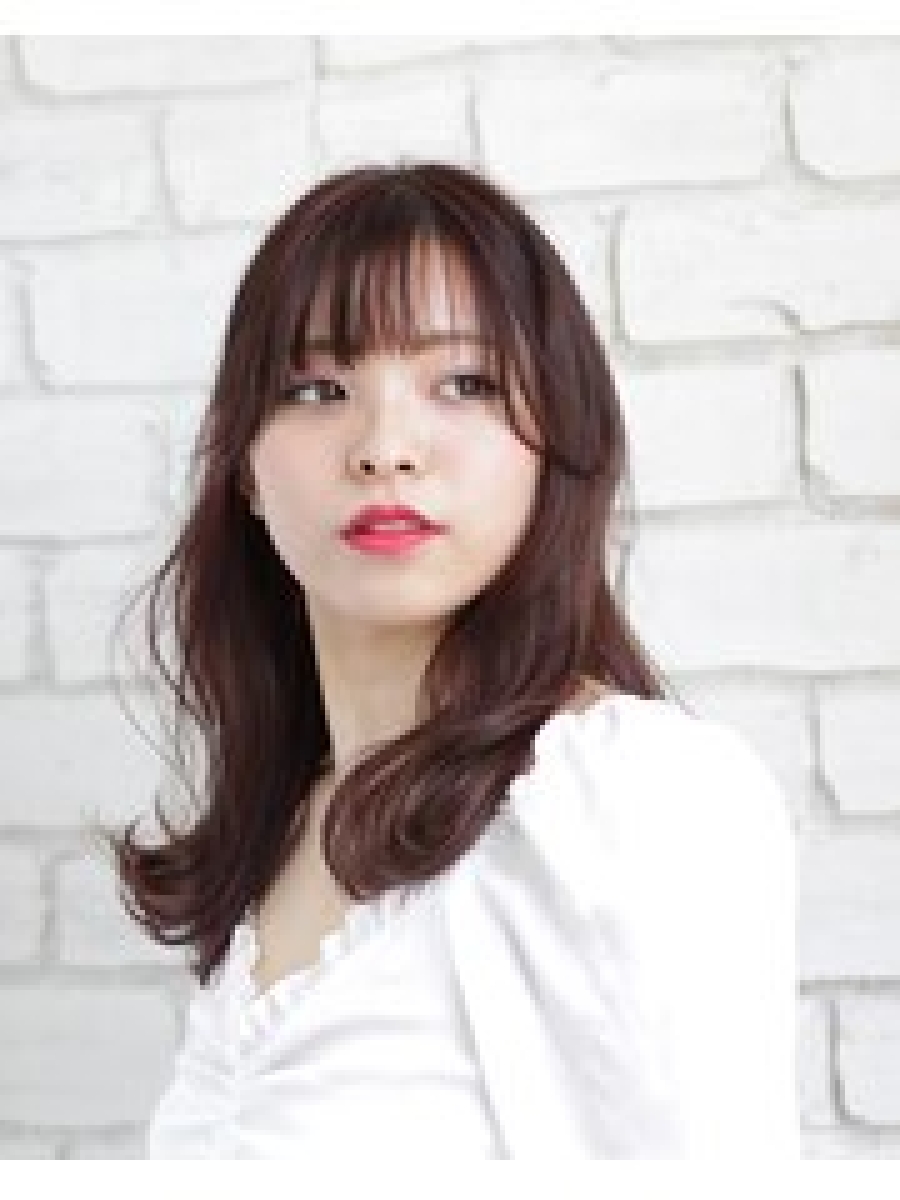 ワンレンのセミロングにピンクブラウンで可愛さUP。コテで緩く巻いてガーリーな印象に。
